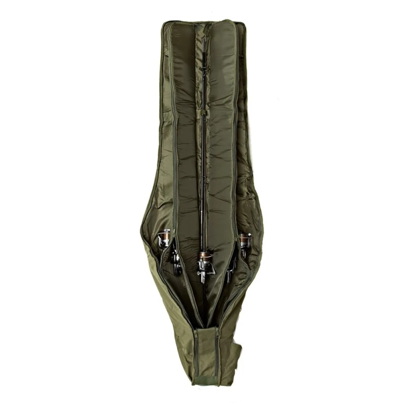 Die gepolsterte Hülle schützt die Ruten durch eine umfangreiche Beschichtung und kann durch die seitlichen Reißverschlüsse geöffnet werden. Es hat genügend Kapazität, um große Rollen und Ruten mit 50mm Ringen aufzunehmen. Weitere Features sind die Verstärkung mit Nyplex, ein Neopren-Griff und ein gepolsterter und verstellbarer Schultergurt mit Metallschnalle. Es gibt zwei äußere Manschetten für den Transport von Schirmen, Kescher etc.